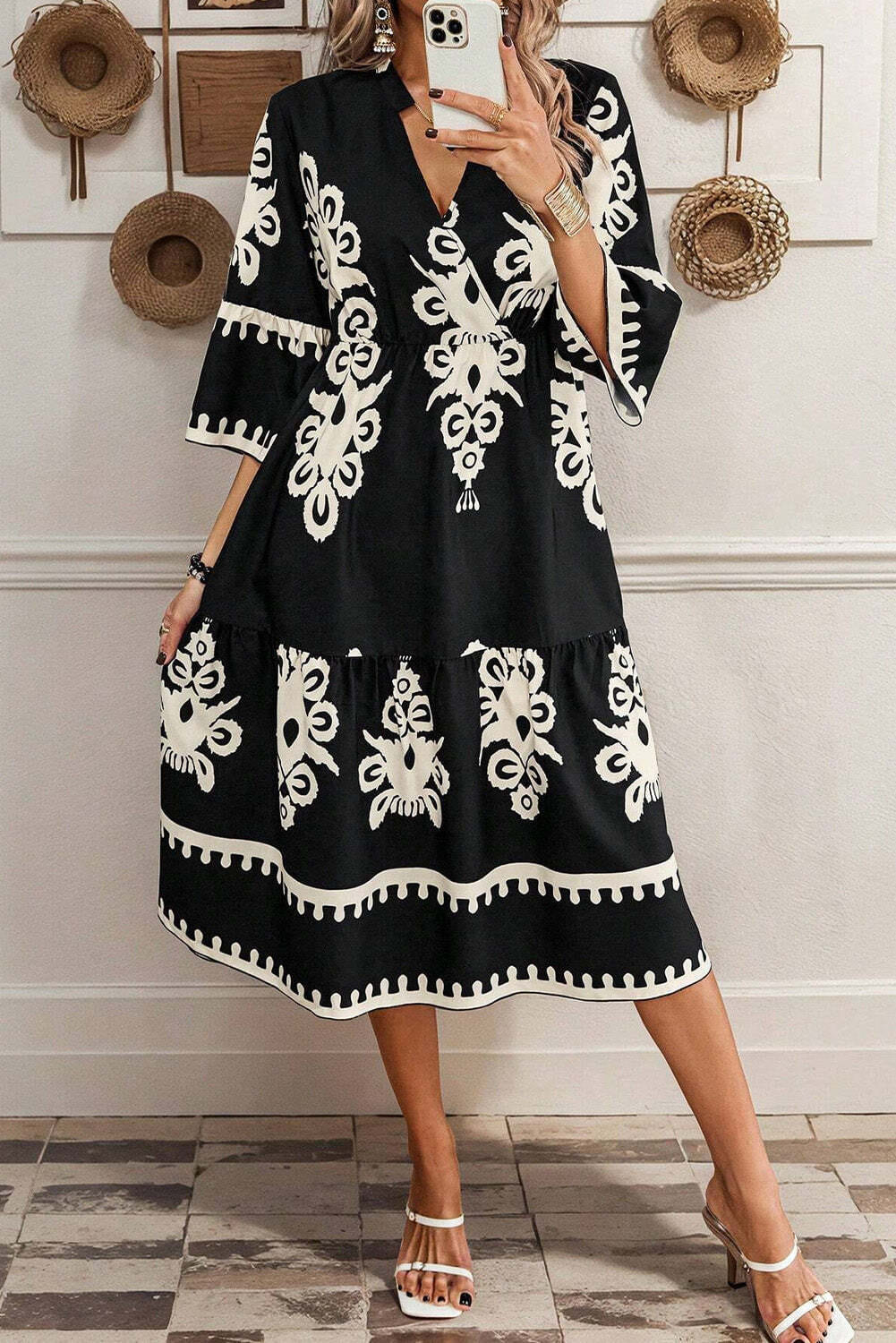 Black Western Geometric Print 3/4 Sleeve Loose Midi Dress