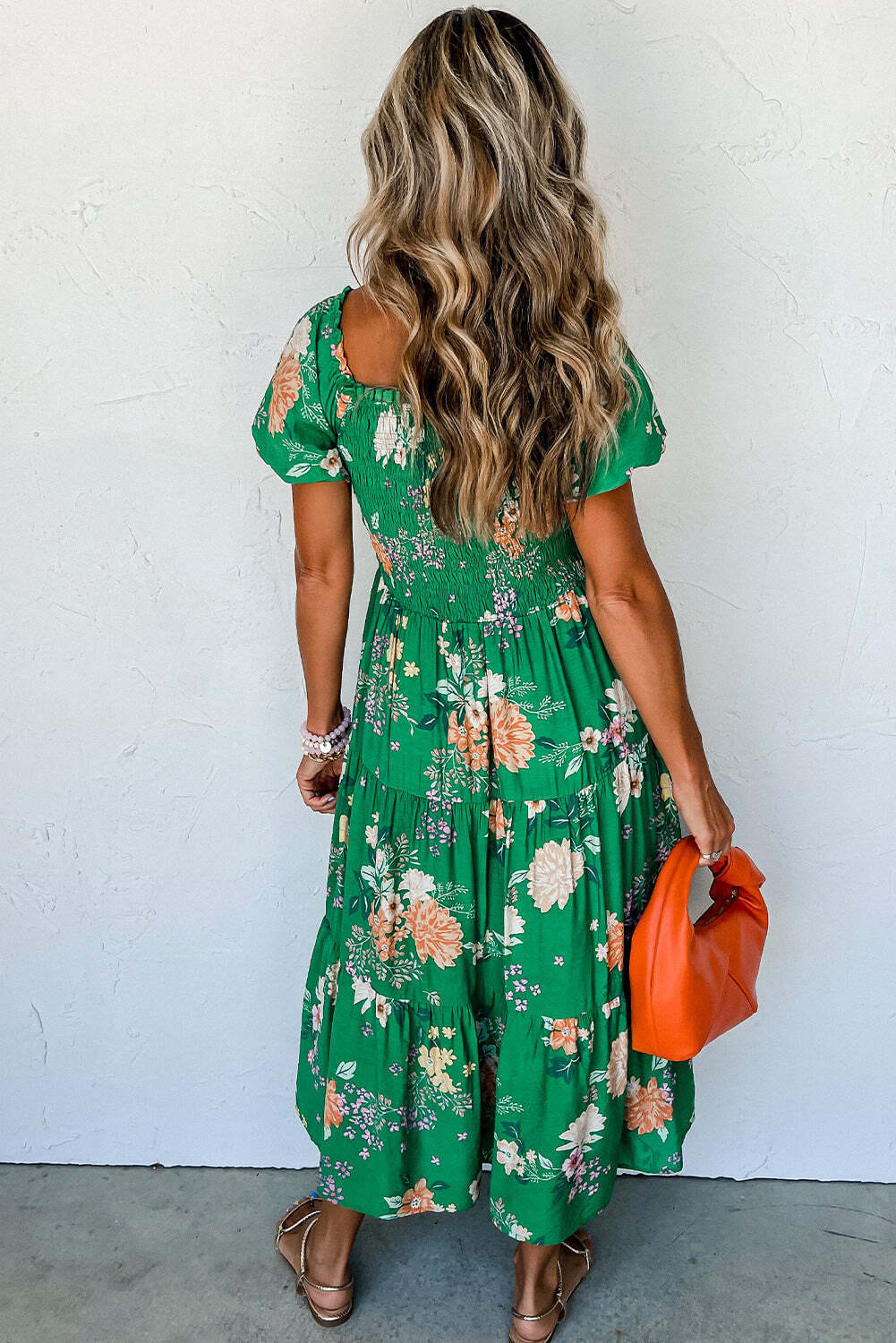 Green Floral Print Bubble Sleeve Smocked Tiered Midi Dress