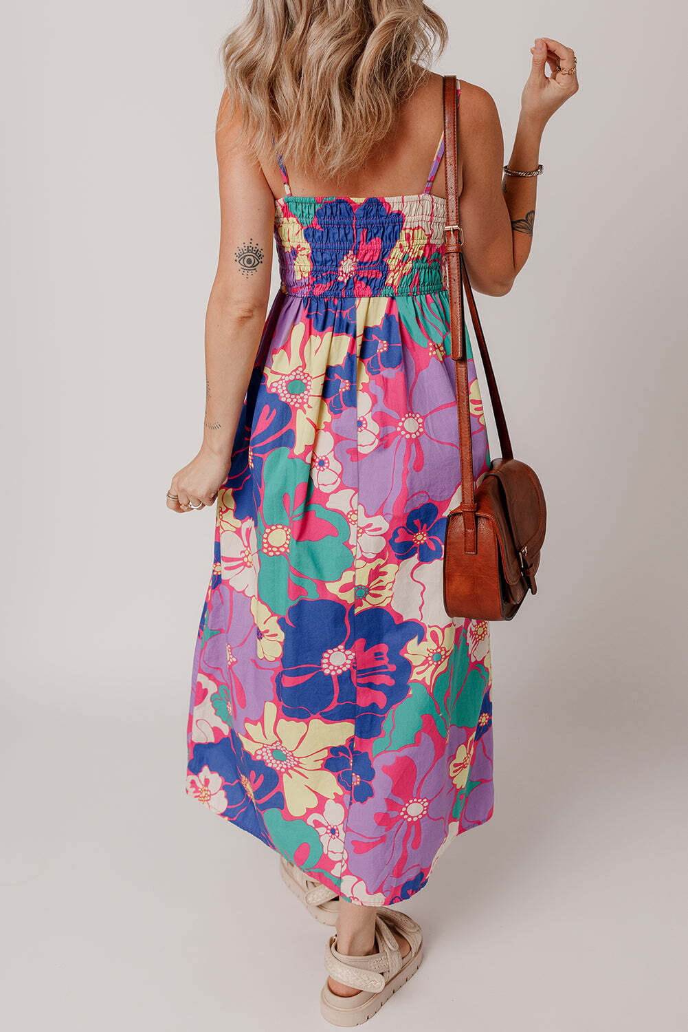 Purple Floral Print Shirred Spaghetti Strap Loose Maxi Dress