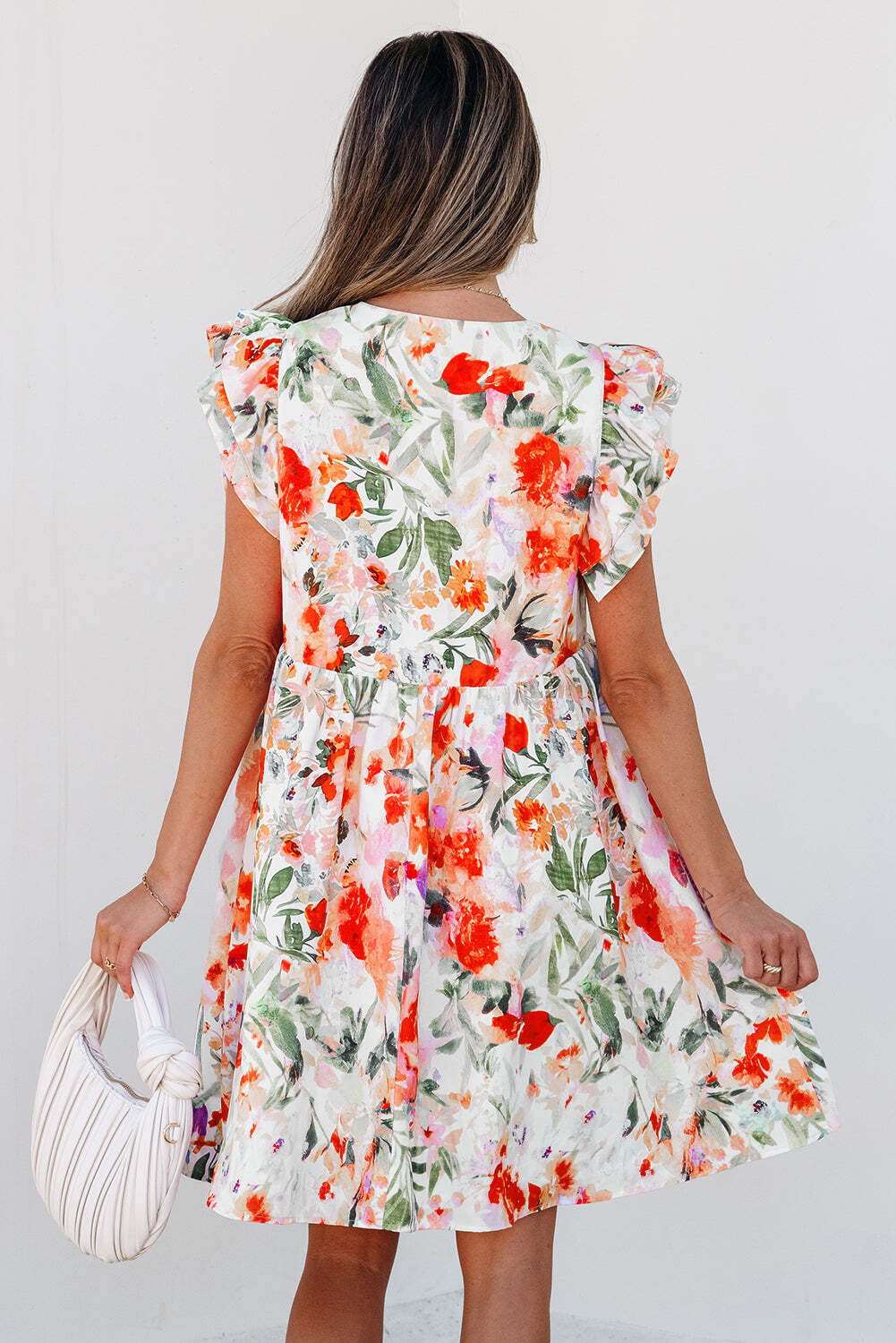 Pink Floral Double Ruffle Sleeve V Neck High Waist Mini Dress