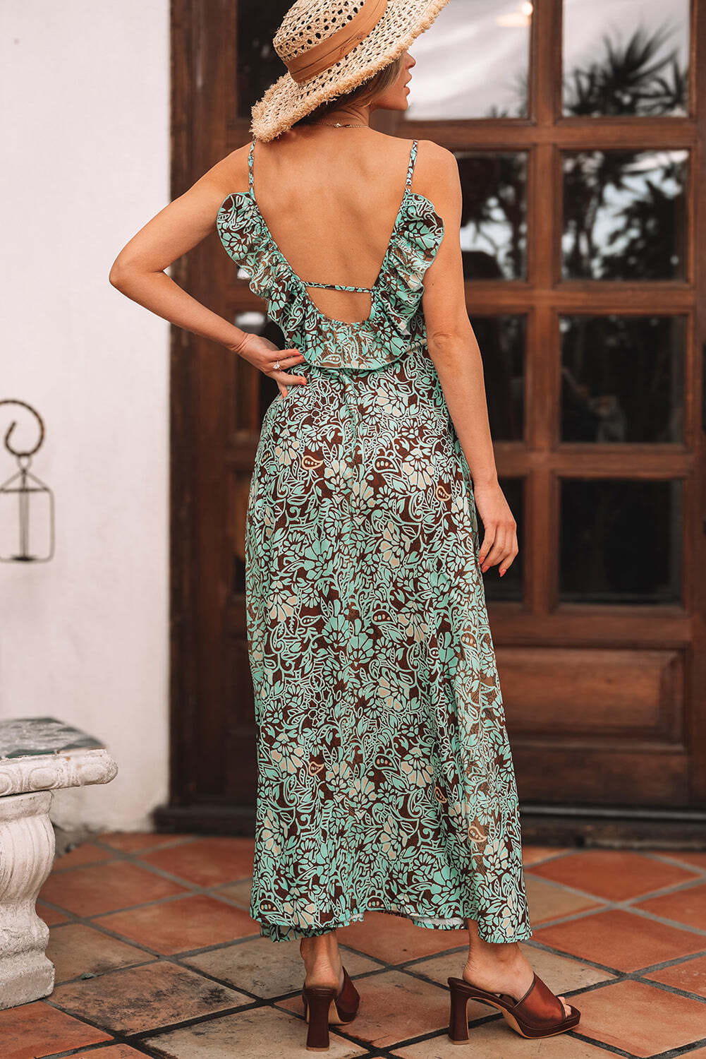 Green Floral Print V Neck Ruffled Trim Backless Tassel Waist Maxi Dress