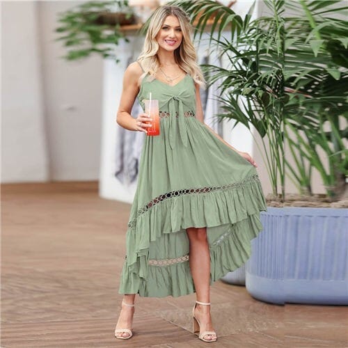 Summer Chiffon Irregular Lace Suspender Long Dress – Green