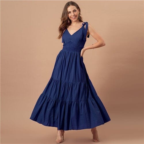 Summer Bow-knot Shoulder Strap Solid Color French Style Romantic Jacquard Dress – Ink Blue