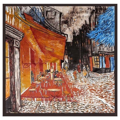 French Coffee Shop Oil Painting Theme 90*90 cm Artificial Silk Women Square Scarf – Brown