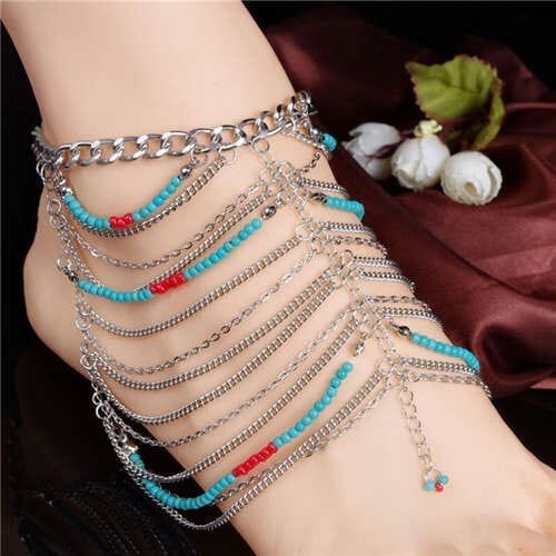 Artificial Turquoise Beads and Multiple Chains Bohemian Design Women Alloy Anklet